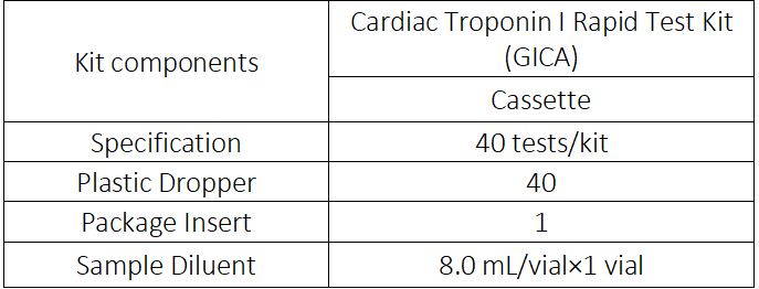 The Cardiac Troponin I Rapid Test Kit (GICA) is a rapid chromatographic immunoassay for the qualitative detection of human Cardiac Troponin I in whole blood, serum or plasma as an aid in the diagnosis of myocardial infarction.