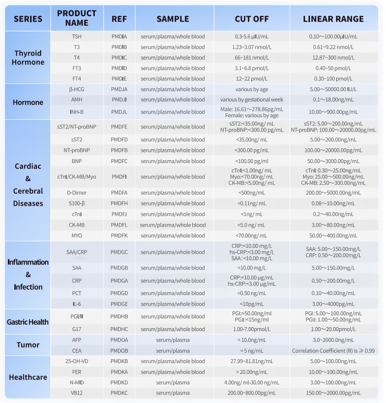 PMDT9000 Immunofluorescence Quantitative Analyzer is an analyzer for processing and analysis of PMDT test kits including markers for cardiovascular diseases, renal diseases, inflammation, fertility, diabetes mellitus, bone metabolism, tumor, and thyroid, etc. Immunofluorescence analyzer PMDT9000 is used to measure concentration of biomarkers in human whole blood, serum, plasma or urine samples. The fluorescence analyzer’s results can be used as an aid in clinical diagnosis of laboratory and point of care testing. Immunofluorescence analyzer is applicable in Emergency, Clinical Lab, Outpatient, ICU, CCU, Cardiology, ambulance, operating room, wards, etc.