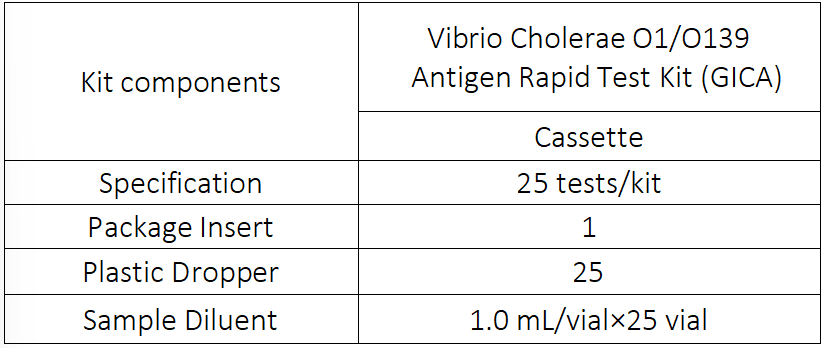 Kit components: Vibrio Cholerae O1/O139 Antigen Rapid Test Kit (GICA)